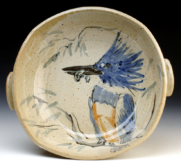My kingfisher pots are pretty one-of-a-kind, too. I paint him on pasta bowls, serving bowls, and the occasional square baker. Where he's been known to make quite a splash...