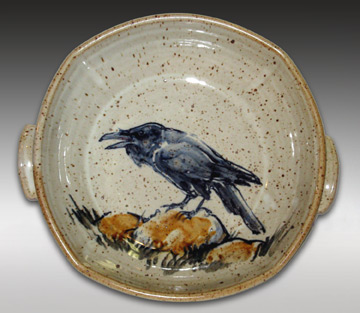 After that trip, I started painting ravens on serving bowls, pie plated, pitchers. Sometimes it's hard to differentiate them from crows, without the clue of size. Look for the ruff, the feathered bill, but don't be surprised to guess wrong.